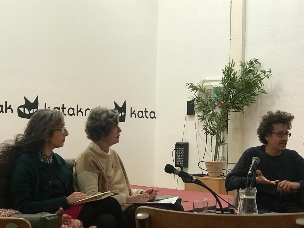 Iruñea, 4/1/2023: conversatorio en la librería Katakrak, junto a Mari Luz Esteban y Eva Fernández.